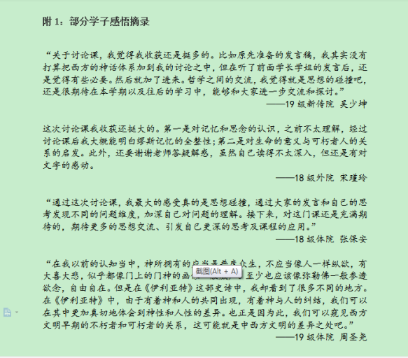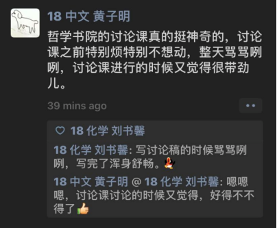 研讨课中的沟通交流师生教学相长的过程,也是一种对自我的重新审查,但是漫无目标、空洞无物的思考往往会适得其反,爱一帆 的小班研讨是教导学生言之有物,有的放矢。通过对文本的解读找到审查生活的坐标,且看同学们如何在研读中升华思想:
