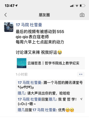 本次讨论课因为特殊的现实情境通过线上开展,同学们虽居家“独学”,然何患无友?云端研讨事先由助教与老师沟通确定主题,随后根据学生情况进行分组,要求学生提前形成讨论文稿,再经助教反复修改,通过线上平台进行观点分享。而所谓哲思从来都是从认识自身、审视生活开始。心性的养成不能对生活袖手旁观,书院的研讨正是围绕现实而展开,且看同学们是如何在追问中反思生活