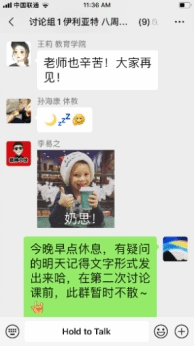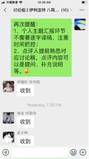 作为本学期的第一次讨论课,为了让同学们更加从容地在线分享及问题回顾,采用微信群逐条语音形式进行。讨论课共分三个环节,从个人汇报、自由讨论到一句话小结,同学们准时上线,积极参与,热闹有序。
