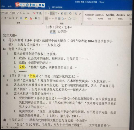 其一是哲学史上有哪几种“异化”?同学们根据阅读和论文学习,从词源学等角度,追溯“异化”概念的起源和发展。对卢梭政治异化、黑格尔绝对精神异化、费尔巴哈宗教异化、国民经济学家经济异化等理论进行了深层阐释,探索哲学理论之间的继承发展的逻辑。不少非本专业同学因此对是哲学史有了探索的兴趣。