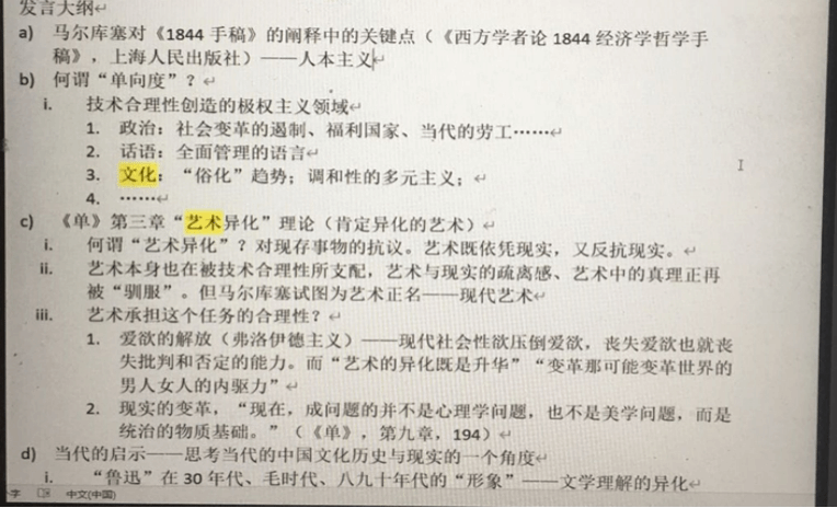 其三是西方马克思主义者对“异化”概念的继承和发展?比起马克思,西方马克思主义者更贴近我们当今的时代。西方马克思主义者继承马克思“异化”逻辑,并以此为支点进行社会批判。虽然有浪漫主义的理论局限,但是强有力的现代性批判引起了同学们共鸣。韦伯、卢卡奇、马尔库塞、弗洛姆、鲍德里亚等哲学家的异化理论,成为了讨论课的热点之一。大家从各自专业出发,各抒己见,收获满满。
