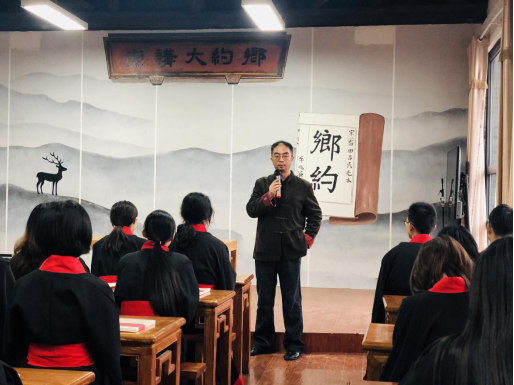 长安校区启程,开启了本次游学之旅。近两个小时的车程后,师生到达了位于蓝田县白鹿原民俗文化村的芸阁书院。首先,师生们跟随讲解员参观入泮广场、孔子像、蓝田先生像、“乡约”展壁、“训词”展壁、“孔子事迹”展壁、芸阁书院展厅等地。在参观中,师生真切地了解了牛兆濂先生的生平与行迹,学习了乡约文化的历史意义与当代传承,并对书院的时代价值有了近距离的感受。