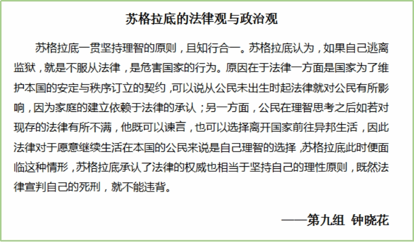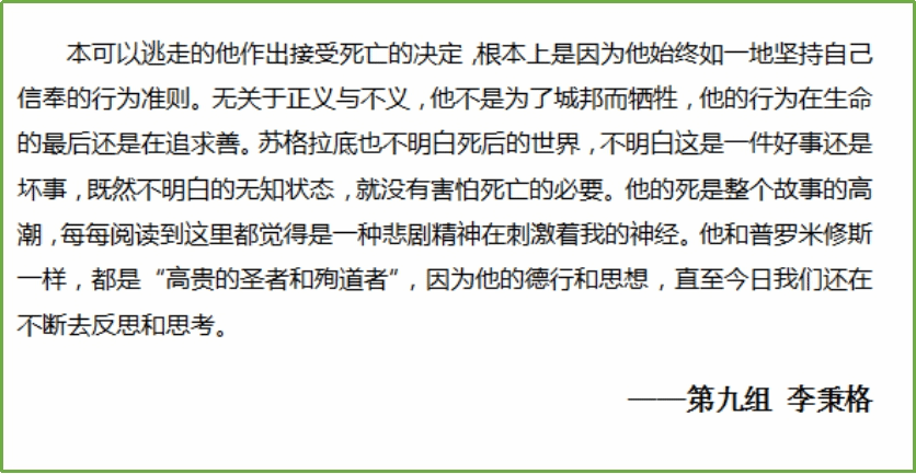 专业导师石碧球老师带读。本次读书会采用了老师导读,小组讨论,成员撰写阅读心得,集中讨论,最后小组互评和老师点评的形式,同学们积极参与,讨论热烈,收获良多。在逐步深入的交流中,师生共同走近苏格拉底,领略了苏格拉底的智慧,走近那个伟大的时代,探讨了古希腊雅典时期的时代特征。每个小组成员都受益颇多,不仅学习到了深厚的经典知识,而且在和小组成员的交流讨论中碰撞出了思想的火花,并且穿梭时空和苏格拉底进行了充满智慧的对话,可谓一举多得。到此,西方哲学经典“云”读书会圆满结束,虽然读书会已经结束,但其带给我们的启发却令人回味无穷,相信同学们也在这过程当中进一步了解了古希腊雅典文化,也更加激发了同学们对其的兴趣。生命不息,阅读不止!望同学们继续在学海中探寻自己的智慧!继续充实自己!