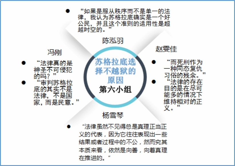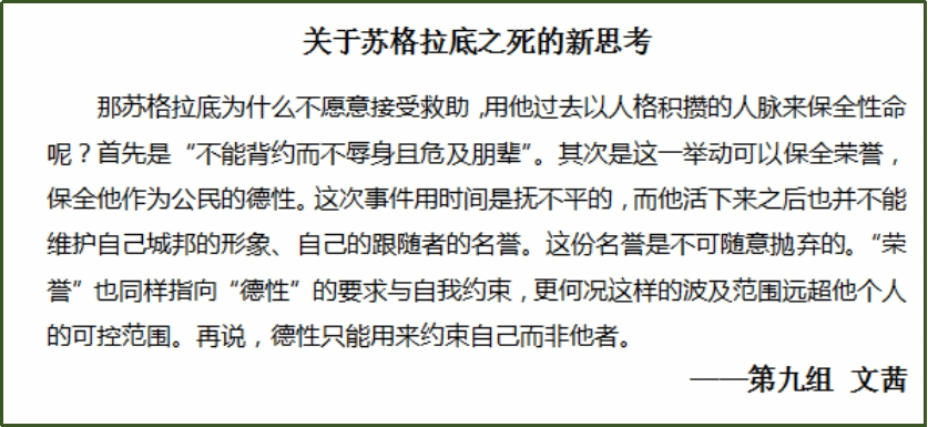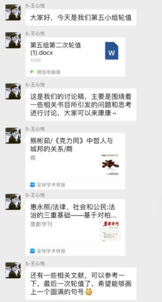 本周是读书会的最后一周。经过前两周对《苏格拉底的申辩》的细致阅读和审慎思考,同学们都对苏格拉底之死引发的一系列问题作出了自己的回答。本周进入《克力同章句》的阅读,同学们从更多的角度出发,探讨苏格拉底的哲学思想与形象。在每日轮值小组的带领和引导下,大家围绕《克力同章句》提出诸多问题,展开有序的讨论,互相分享延伸阅读的材料。基于理性的思考和包容的态度,来自不同专业的同学得以对自己的观点进行阐发和辩护,思想碰撞的火花也得以闪烁其光。