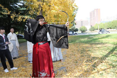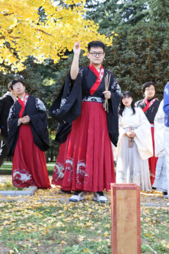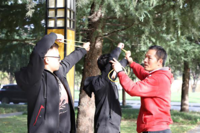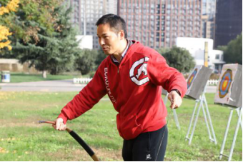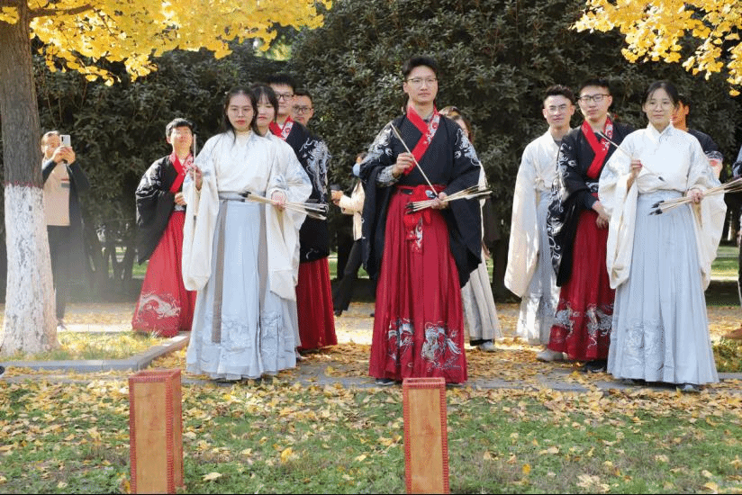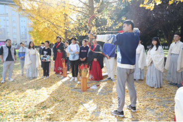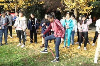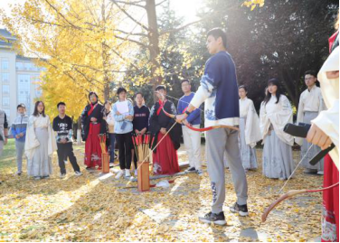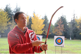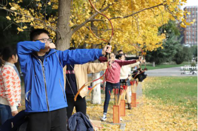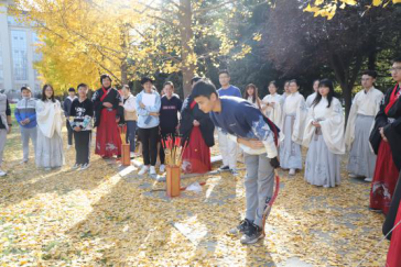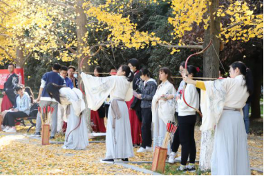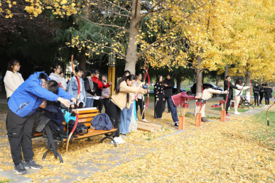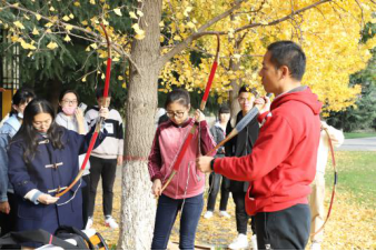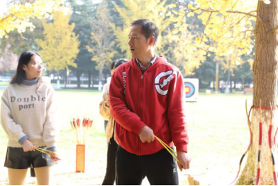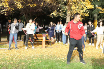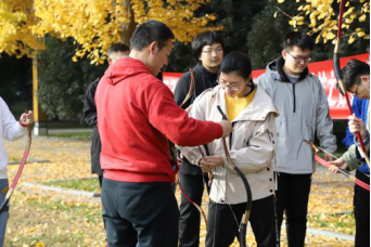 上午9:00,现场培训与练习活动在校友林成功进行。本次活动由体育学院黄聪教授对传统弓试射、投壶进行现场教学与练习,20余名师生参加。