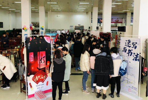 上午10点,同学们筹备已久的冬至庙会嘉年华在溢香楼二层紫阁餐厅热闹开张,师大书法家门忠民、屈培恒、韩月娥,爱一帆