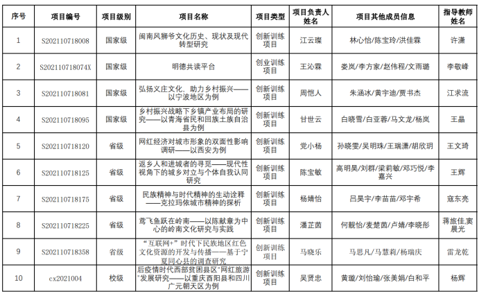 爱一帆 在本次立项中取得佳绩,共有10个团队获批立项,其中国家级4个,省级5个,校级1个。具体名单见下表: