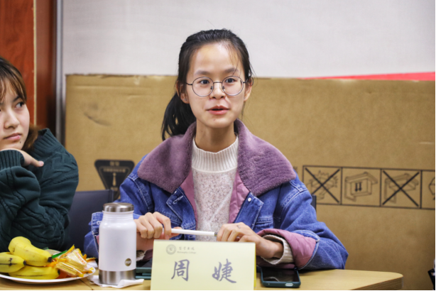 来自外国语学院英语专业的张玺同学分享了自己被书院感动的经历。提起曾经去草堂寺的活动,书院贴心地在行程中设置了“破冰活动”,也让自己收获到多位良友此外,她认为自己并不外向活泼但在书院也能感受到被尊重,被记住说罢,她拿起面前桌签名牌现身说法,不仅是老师尊重同学,同学之间的关系也让自己感到很舒适在书院很有归属感,是家的感觉。