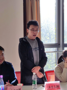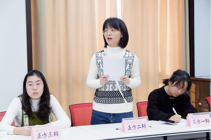 专业导师、哲学博士刘佳宝,谈弈辩论队执行教练、新闻与传播学院陕翔,法学会辩论队18级队长、哲学与政府管理学院傅传祥担任;下午场评委由哲学博士张海满、新闻与传播学院师艺丹、哲学与政府管理学院刘家鼎担任。雪后凛冽的空气挡不住选手们火烫的热情,八支队伍就不同辩题展开了激烈的唇枪舌战。