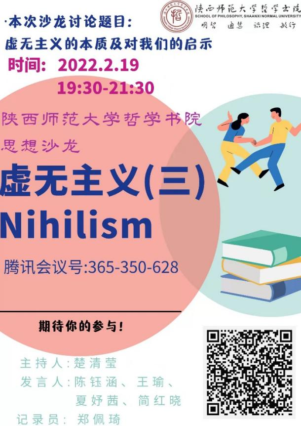上一次,我们讨论了虚无主义在文化影视作品中的体现,大家精彩的分享为我们呈现了一场视听盛宴。本次沙龙将主要讨论虚无主义的本质及对我们的启示,依旧会有四位同学与我们分享自己对虚无主义本质及启示的看法。我们能从虚无主义浪潮中学到什么呢?敬请期待!其他同学也会在四位同学发言结束后参与交流环节,分享自己的观点和看法。欢迎老师同学们前来与我们一起探索!