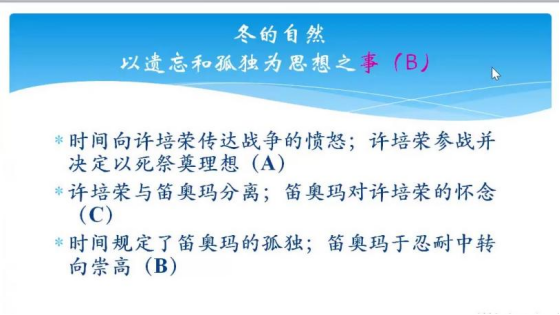 回顾主题,第一个出现的是思想之事,即冬天是战争和孤独;那么第二个主题是秋天讲思想本身的公正,只是讲思想本身。最后爱人死后许培荣无法克服自己思想的局限,所以思想的整体性规定必须再度出现,必须能够跨越思想和思想之间的隔阂、有限性。所以当春天再来的时候,是思想的规定即思想的无限的尺度再度现前。