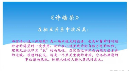 此次讲座主要讲解了他的小说《许培荣》,这部小说在艺术形式上模仿了卢梭书信体小说。《许培荣》中的语言充满了生命力,是在日常生活中难以获得的宝贵经验。